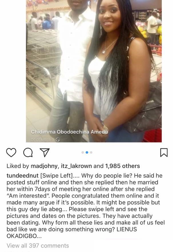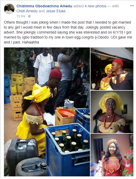 According to Chidimma claims, he made the post on the 30th of December, Sophy commented on the same said date, and they got married on the 6th of January in 2018.