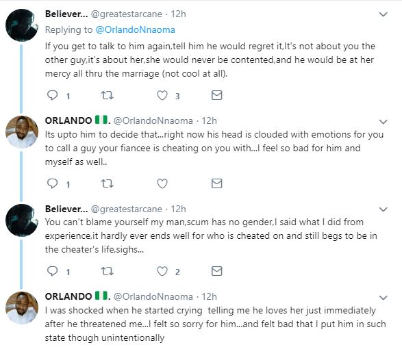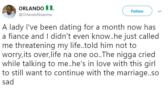 A lady I’ve been dating for a month now has a fiance and I didn’t even know..he just called me threatening my life..told him not to worry,its over,life na one oo..The nigga cried while talking to me..he’s in love with this girl to still want to continue with the marriage..so sad