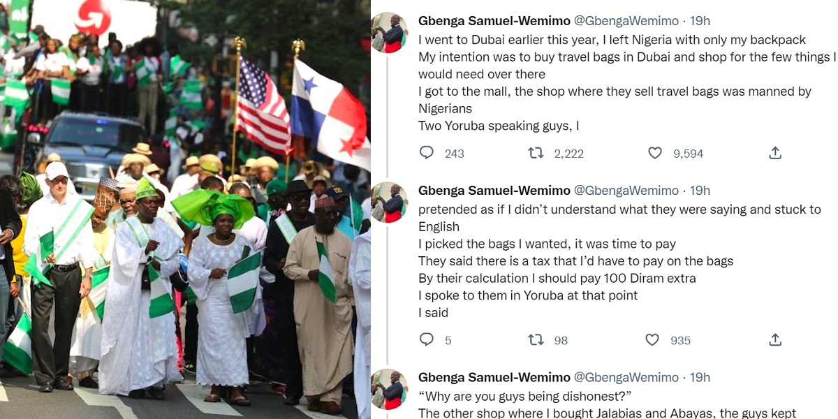 The man with username, @GbengaWemimo shared that during his visit to UK and Dubai, some Nigerians tried to dupe him, one tried to sleep with him and another abused him verbally.