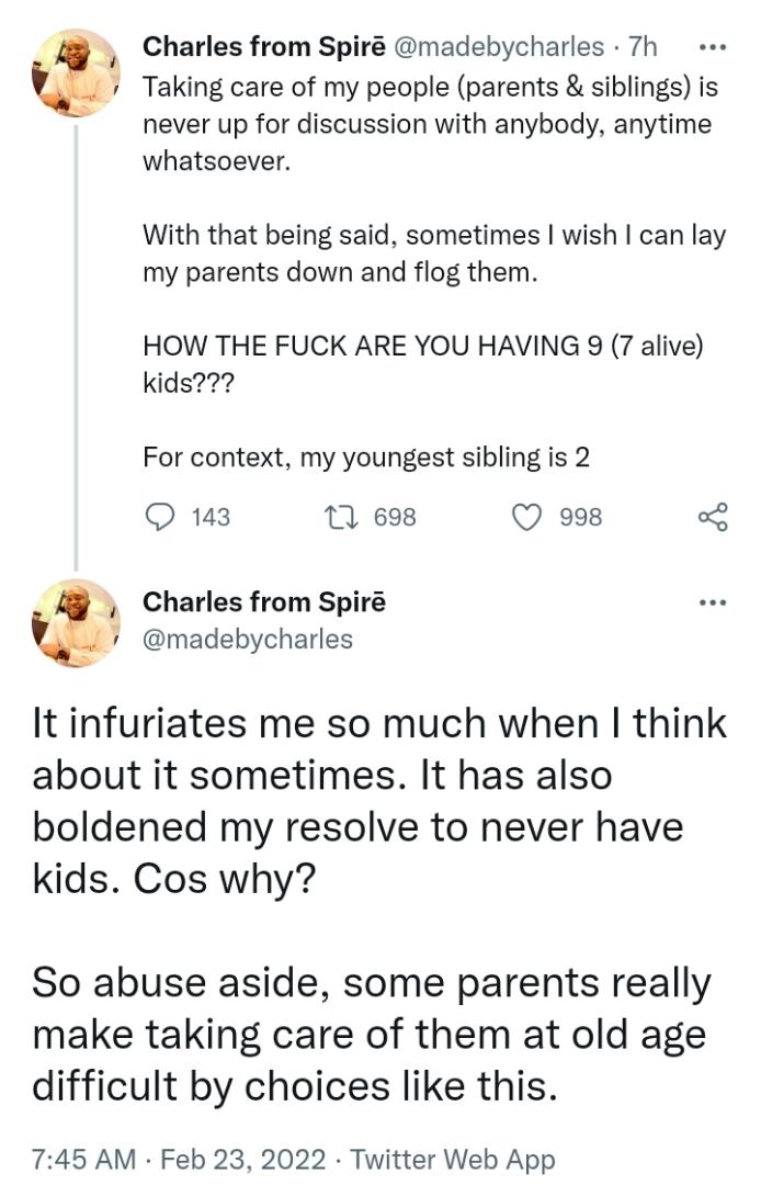 According to the entrepreneur with handle @madebycharles, his parents gave birth to 9 children, 7 of whom are alive, and the youngest is 2-years old.