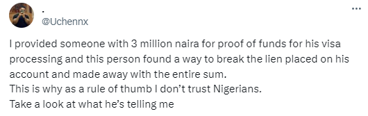 “I provided someone with 3 million naira for proof of funds for his visa processing and this person found a way to break the lien placed on his account and made away with the entire sum.