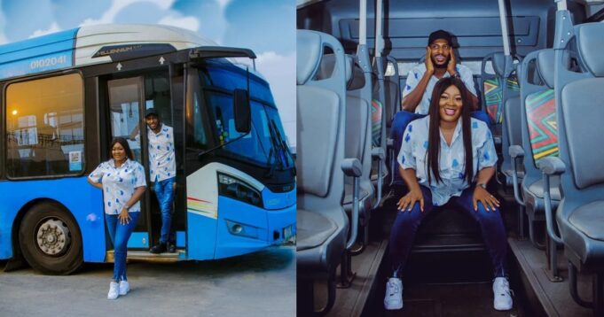 The young man identified as Lola Okunrin took to Twitter to share their creative pre-wedding photos. Lola, who tagged their unique love story “Love on the Move,” noted that they decided to snap the pre-wedding photos on a BRT bus, which is where they first met.