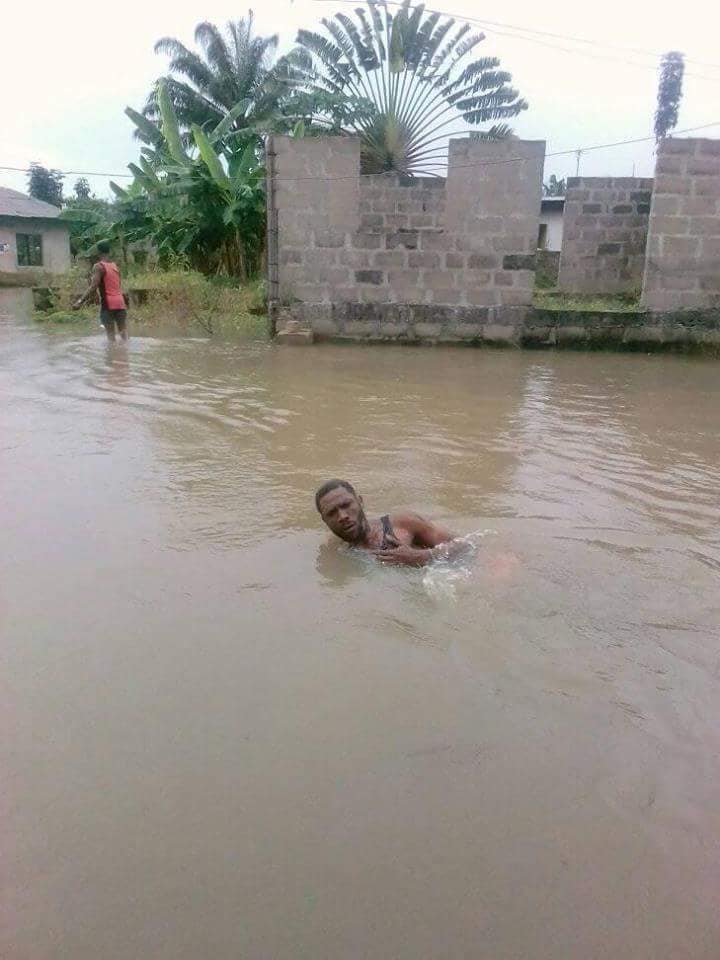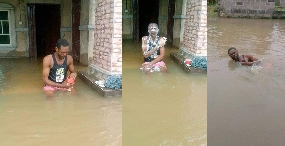 A Nigerian man decided to make good of a situation, after a massive flood overtook his home. The young man shared pictures which appear to show him bathing and also swimming in the massive flood.