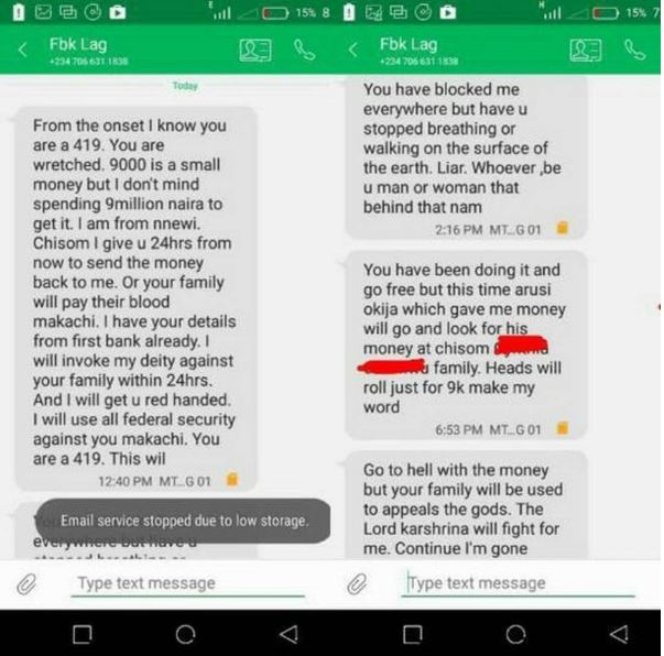 A furious Nigerian man, who apparently had a thing for one Chisom on Facebook, has resorted to invoking his village’s gods on the lady after she allegedly failed to visit him even after he sent her money for the visit.
