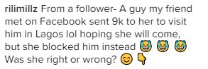 The SMS thread screenshot which was shared by @rilimillz on IG, shows that the man who met the lady on Facebook, got blocked after he sent her N9,000 to visit him in Lagos.