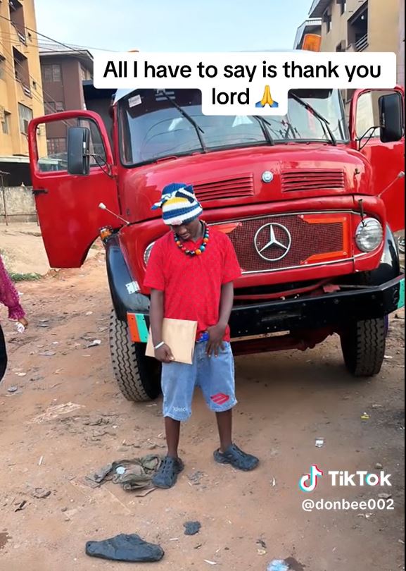 A young Nigerian man recently took to social media to share his excitement after purchasing a brand-new tipper truck, christening it ‘Big Benz.’