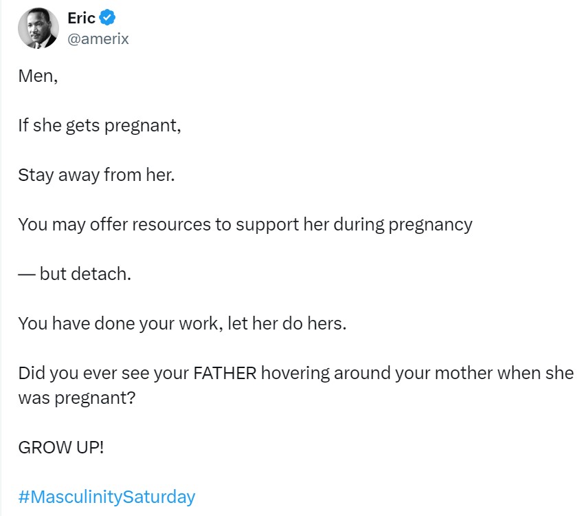 “Men, If she gets pregnant, Stay away from her. You may offer resources to support her during pregnancy — but detach. You have done your work, let her do hers. Did you ever see your FATHER hovering around your mother when she was pregnant? GROW UP! #MasculinitySaturday.”
