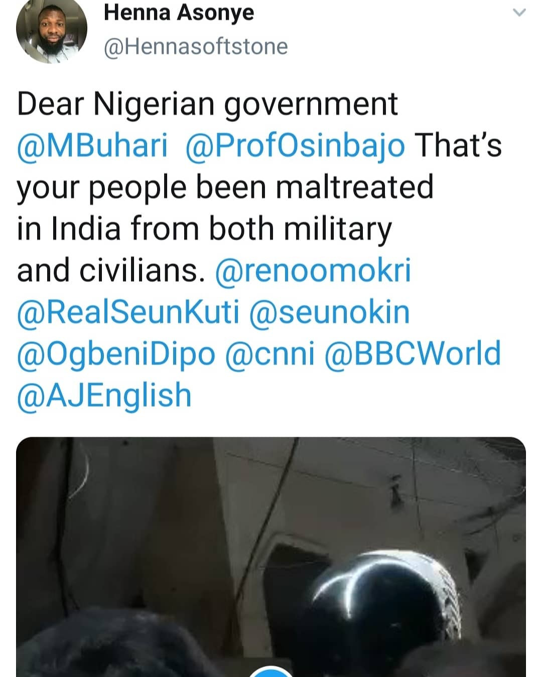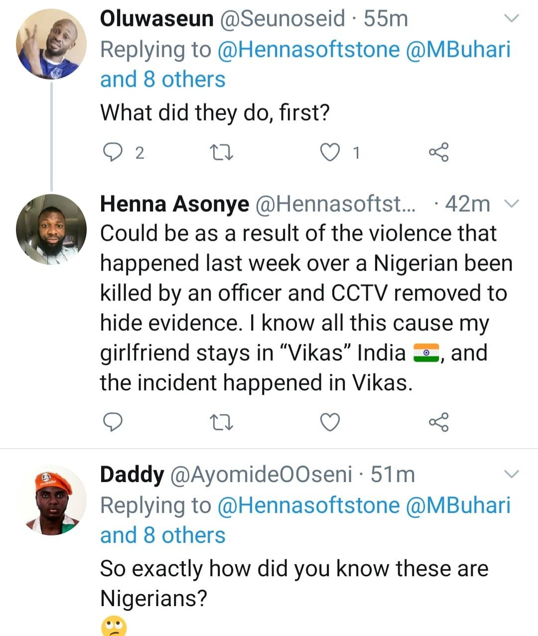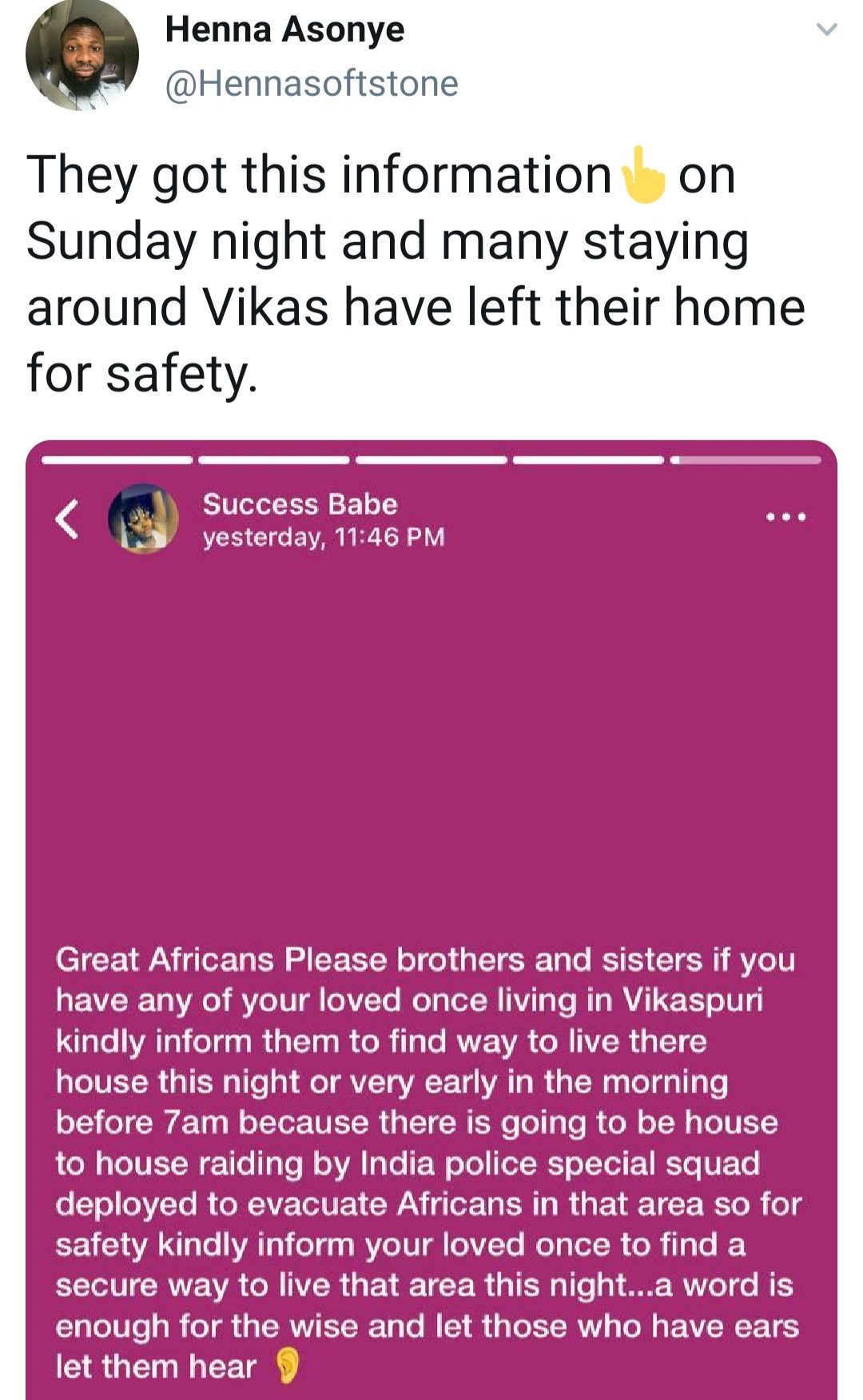 The Twitter user revealed that his girlfriend lives in Vikaspuri, the area where Nigerians were rounded up and brutalised. He went on to add that a warning had been sent out over the weekend, asking all Nigerians in the area to flee.