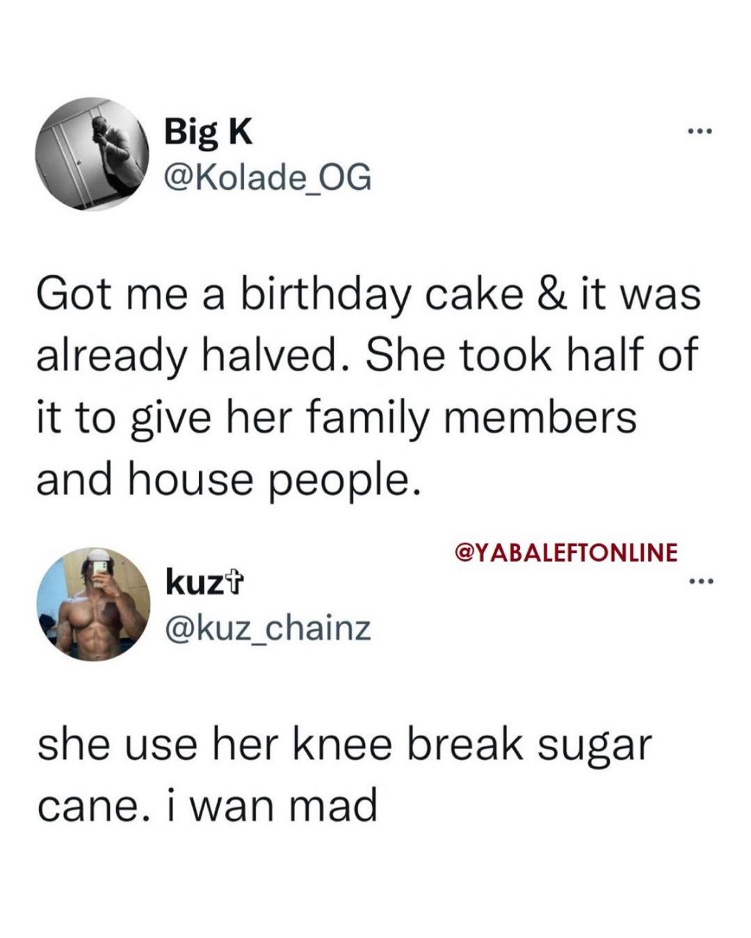 A gentleman revealed that a lady got him a birthday cake but when she delivered it to him, it was already halved because she’d given the other half to her family members.