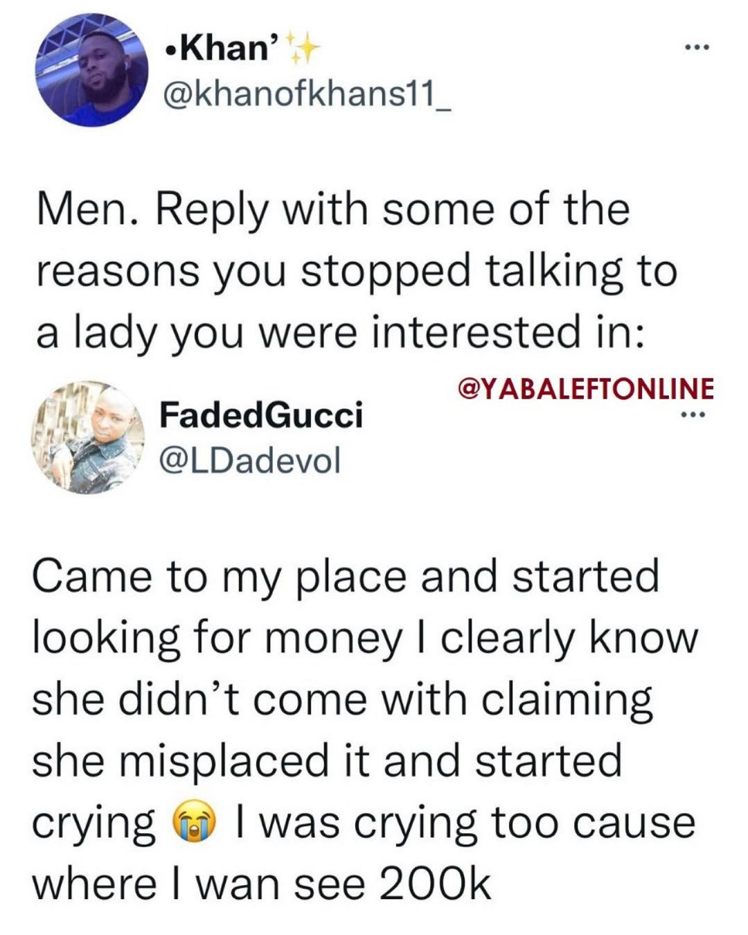 A couple of Nigerian men have taken to microblogging platform, Twitter to share the reasons they stopped talking to women they were at some point interested in.