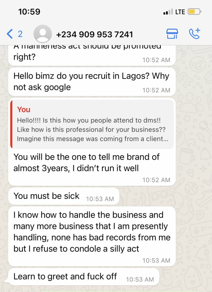 Bimz Model felt disrespected by Ololade’s response, and hurled insults at her for trying to teach her how to run her business.