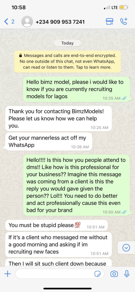 The lady, with Twitter handle @Itsololade_, had sent a message to the modelling agency, simply identified as Bimz Model, on WhatsApp, asking if they are recruiting models in Lagos at the moment.