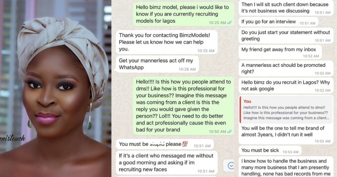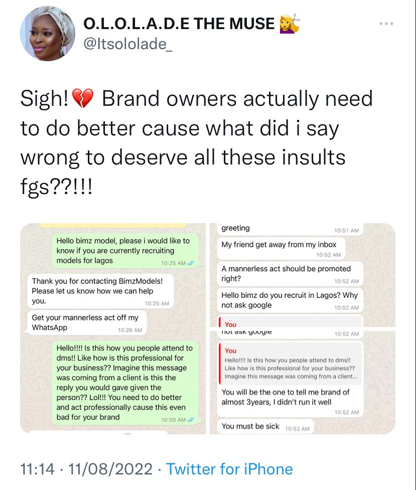 Surprised by the rude response, Ololade asked the modelling agent if she would respond to a paying client in that manner.