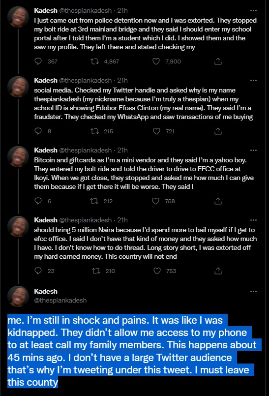 I just came out from police detention now and I was extorted. They stopped my bolt ride at 3rd mainland bridge and they said I should enter my school portal after I told them I’m a student which I did. I showed them and the saw my profile. They left there and stated checking my social media. Checked my Twitter handle and asked why is my name thespiankadesh (my nickname because I’m truly a thespian) when my school ID is showing Edobor Efosa Clinton (my real name). They said I’m a fraudster. They checked my WhatsApp and saw transactions of me buying Bitcoin and giftcards as I’m a mini vendor and they said I’m a yahoo boy.