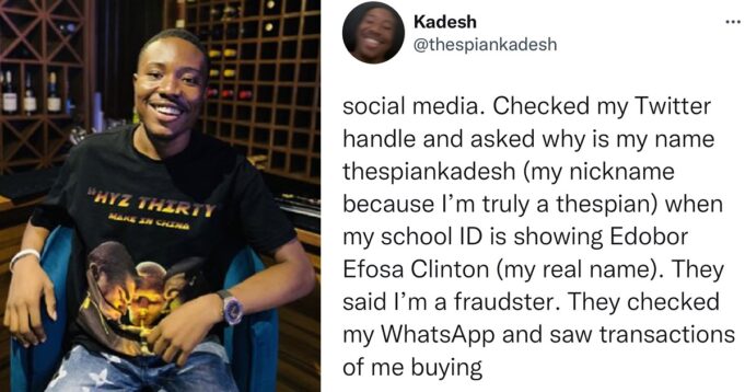 According to the Actor, the Police officers labeled him a fraudster because his Twitter handle was different from his name on his school I.D card.