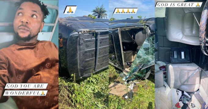 But hours later, the singer shared ghastly images of a car that’d somersaulted and revealed that he was involved in the accident. He also shared a video of himself receiving treatment while thanking God for helping him out alive from the accident.