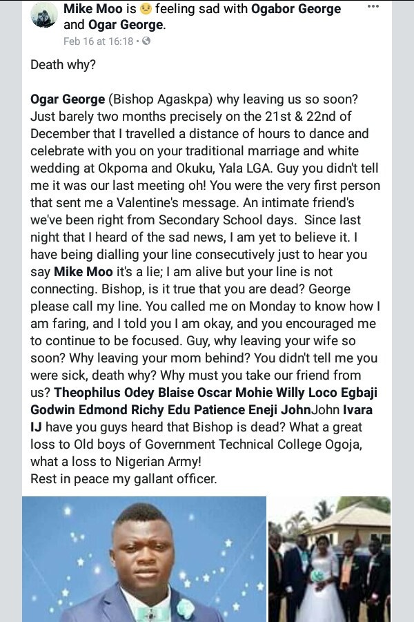 Ogar George (Bishop Agaskpa) why leaving us so soon? Just barely two months precisely on the 21st & 22nd of December that I travelled a distance of hours to dance and celebrate with you on your traditional marriage and white wedding at Okpoma and Okuku, Yala LGA. Guy you didn’t tell me it was our last meeting oh! You were the very first person that sent me a Valentine’s message. An intimate friend’s we’ve been right from Secondary School days. Since last night that I heard of the sad news, I am yet to believe it. I have being dialling your line consecutively just to hear you say Mike Moo it’s a lie; I am alive but your line is not connecting. Bishop, is it true that you are dead? George please call my line. You called me on Monday to know how I am faring, and I told you I am okay, and you encouraged me to continue to be focused. Guy, why leaving your wife so soon? Why leaving your mom behind? You didn’t tell me you were sick, death why? Why must you take our friend from us? Theophilus Odey Blaise Oscar Mohie Willy Loco Egbaji Godwin Edmond Richy Edu Patience Eneji JohnJohn Ivara IJ have you guys heard that Bishop is dead? What a great loss to Old boys of Government Technical College Ogoja, what a loss to Nigerian Army!