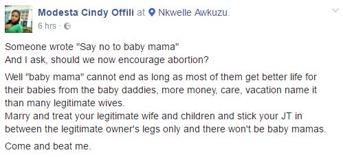 A Nigerian Lady who resides in Anambra has responded to the popular slogan “Say No To Baby Mama.” She says, the baby mama cannot end because most men treat a “Baby mama” better than their wives.