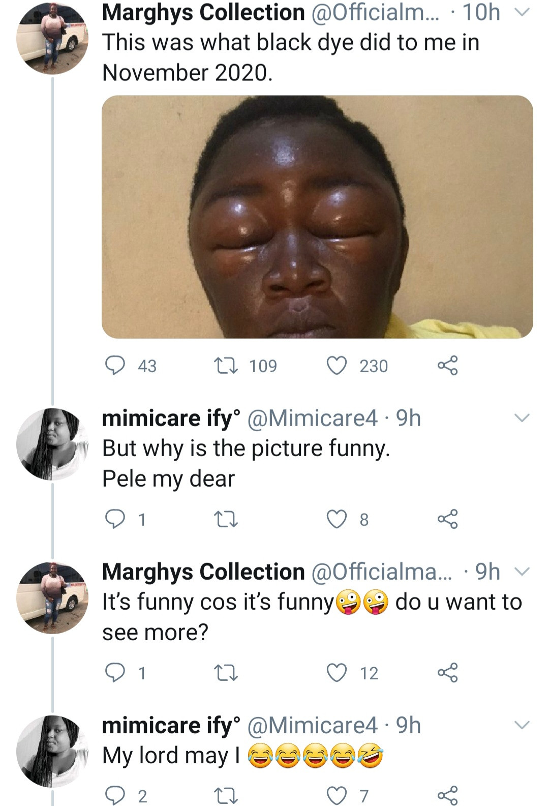 A Nigerian lady identified as @Officialmarghy on Twitter, has taken to the platform to reveal the harm a hair dye product did to her.