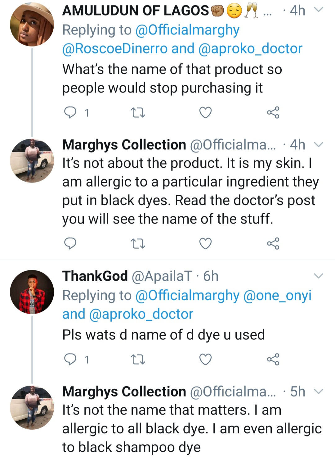 To confirm the Aproko_doctors claim, Marghy shared a similar experience she had with hair dye in 2020.
