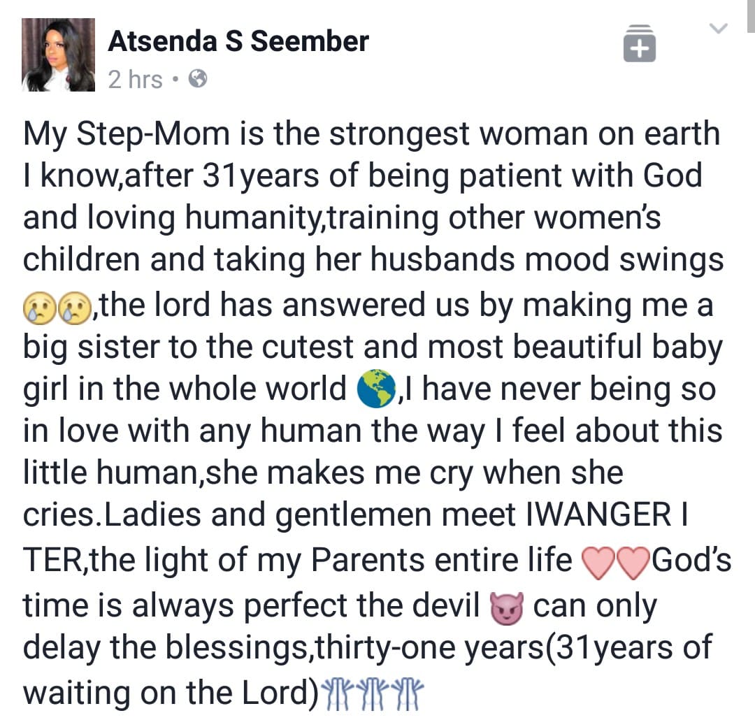 “My Step-Mom is the strongest woman on earth I know,after 31years of being patient with God and loving humanity,training other women’s children and taking her husbands mood swings ??,the lord has answered us by making me a big sister to the cutest and most beautiful baby girl in the whole world ?