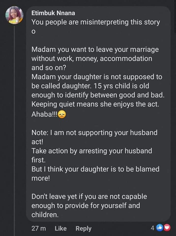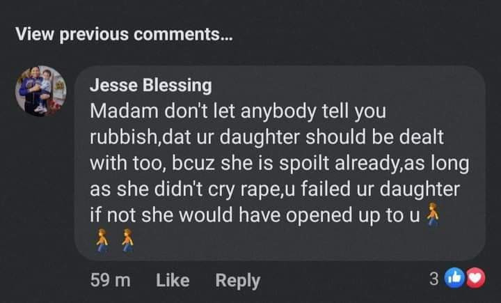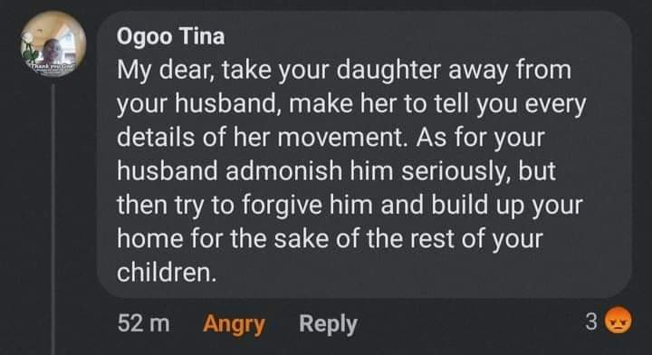 A couple of ladies in a Facebook group specially for mums gave quite shocking replies to a group member who posted that her husband raped her 15-year-old daughter and she was in need of advice.