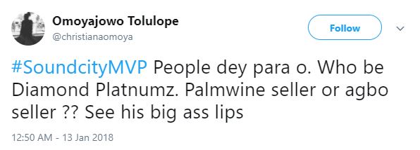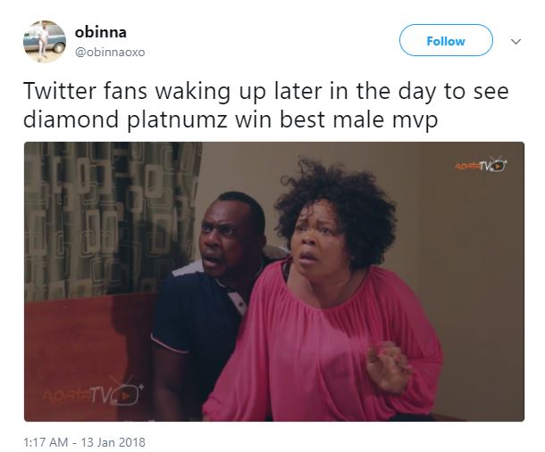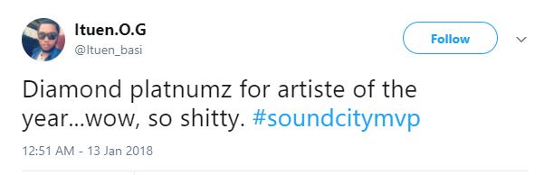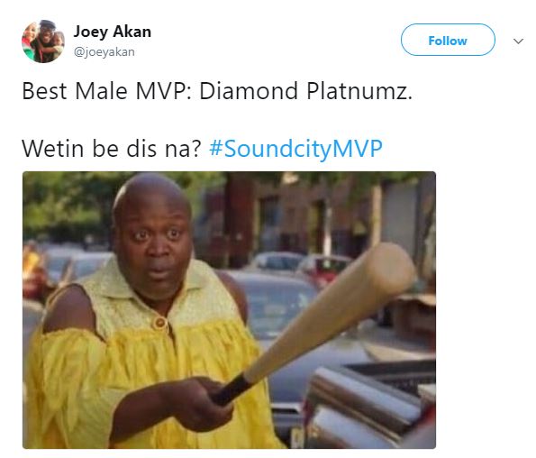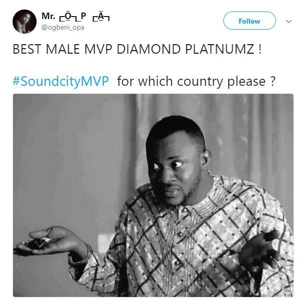 Nigerians on Twitter are angry at Soundcity MVP Awards, after they gave Diamond Platnumz the Best Male Artiste over Wizkid, Davido, Runtown, Olamide and 2Baba.
