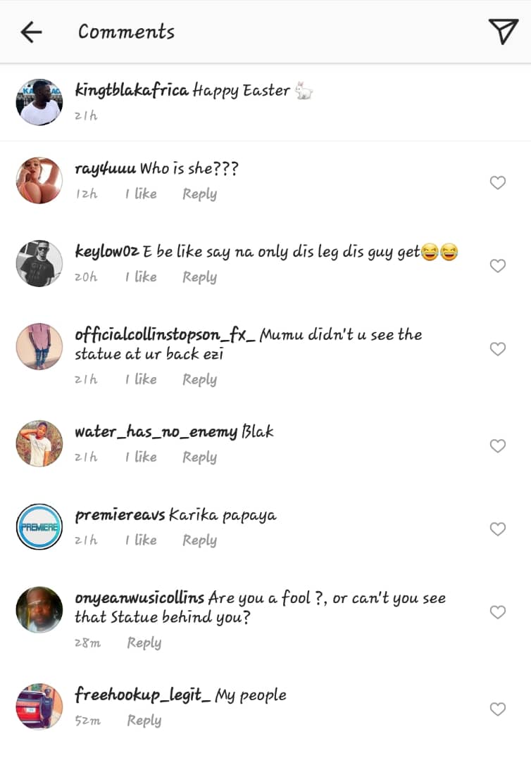 Kingtblakhoc who is a known Nigerian porn star and an atheist, wrote as he grabbed boobs in front of the statue of Mary ‘Happy Easter’.