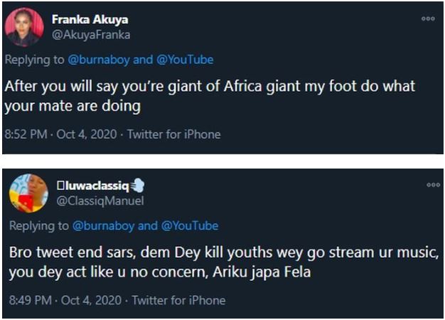 Self acclaimed African giant and Nigerian singer, Burna Boy have been dragged to pieces by netizens over refusal to join other celebrities in the #EndSARS protest.