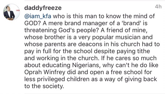 U all re fast to speak insultively to men of God, it’s no problem, after all u don’t have respect for God himself!!!!!… God is Merciful, but went he wants to deal with u, u will wish u were never born!!!!!!!!! U can’t Insult an alfa, Babalawo…. Bcs d take quick action!!!!!!… If only u know d destruction u bring upon ur head wen u insult ministers of God!!!.. Lol…. GO & read ur Bible & see how God destroyed people who did not have respect for ministers of d Lord!!!!!!…… Tomorrow wen u start harvesting ur punishment u start to blame all d witches In ur village!!!!…. It’s not d witches but ur mouth had lead u astray….. If u can’t afford his University, go to d 1 u can afford!!!!!…. U can’t afford Lekki rent u don’t complain about dat u go to somewhere cheaper, so y complaining!!!!!!
