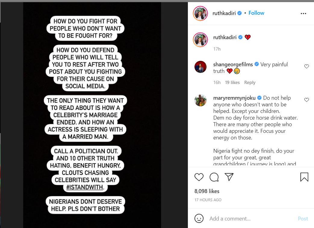 Nollywood actress, Ruth Kadiri has bemoaned the attitude of some Nigerians when public figures try to use their platforms to speak on national issues.