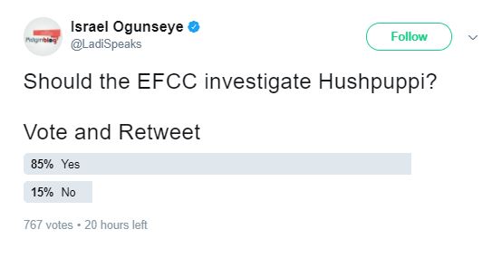 Immediately, a Twitter user, @Ladispeaks, took it upon himself to conduct a Twitter poll where he asked Nigerians if the EFCC should indeed investigate Hushpuppi… and 85% voted yes.