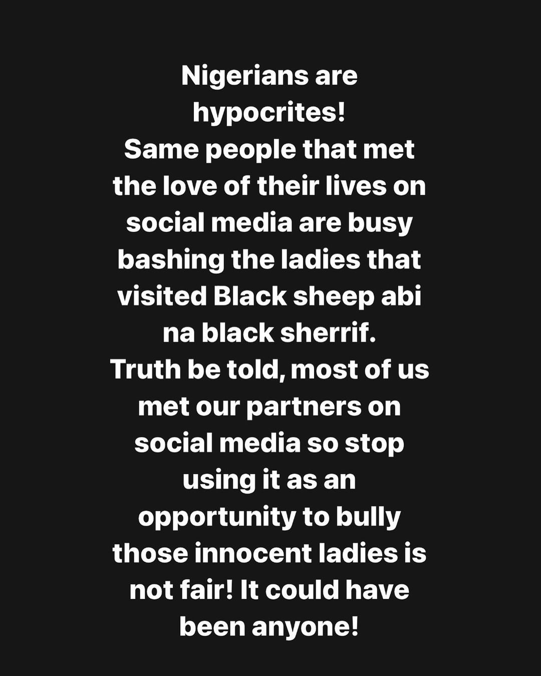 “Nigerians are hypocrites! Same people that met the love of their lives on social media are busy bashing the ladies that visited Black Sheep abi na black sheriff. Truth be told, most of us met our partners on social media so stop using it as an opportunity to bully those innocent ladies is not fair! It could have been anyone!