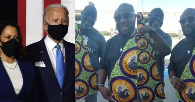In a video that has gone viral, two Nigerian men residing in the diaspora can be seen brandishing the African print with the photos of Biden and Harris imprinted on the fabrics.