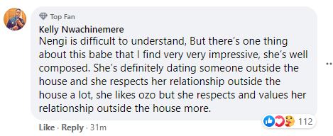 Nengi is difficult to understand, But there’s one thing about this babe that I find very very impressive, she’s well composed. She’s definitely dating someone outside the house and she respects her relationship outside the house a lot, she likes ozo but she respects and values her relationship outside the house more.