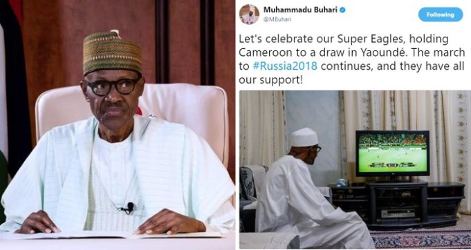 Mr. President watched the Nigeria-Cameroon match at his Daura residence in Katsina State and a while after the match, he shared a photo on Twitter of him seated in his living room while watching the match…