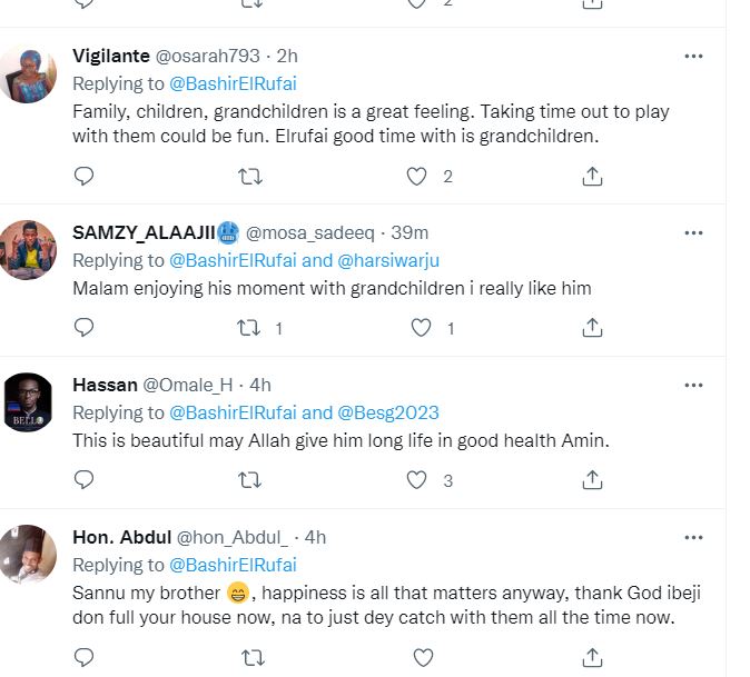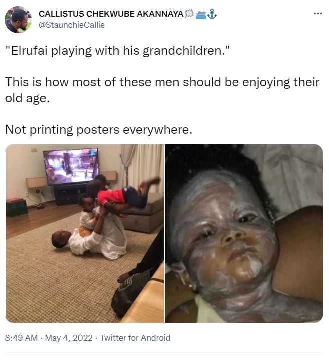 Another Twitter user @StaunchieCallie wrote, “Elrufai playing with his grandchildren. This is how most of these men should be enjoying their old age. Not printing posters everywhere.”