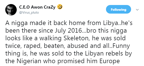 The Twitter user, on his timeline, shared a thread on a friend who attempted crossing from Africa to Europe but was sold off as a slave instead.