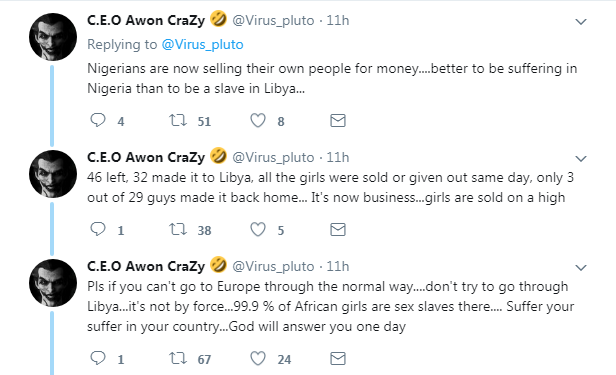 A Twitter user has taken to the platform to alleged that Nigerians are involved in the auctioning of migrants off as slaves in Libya.
