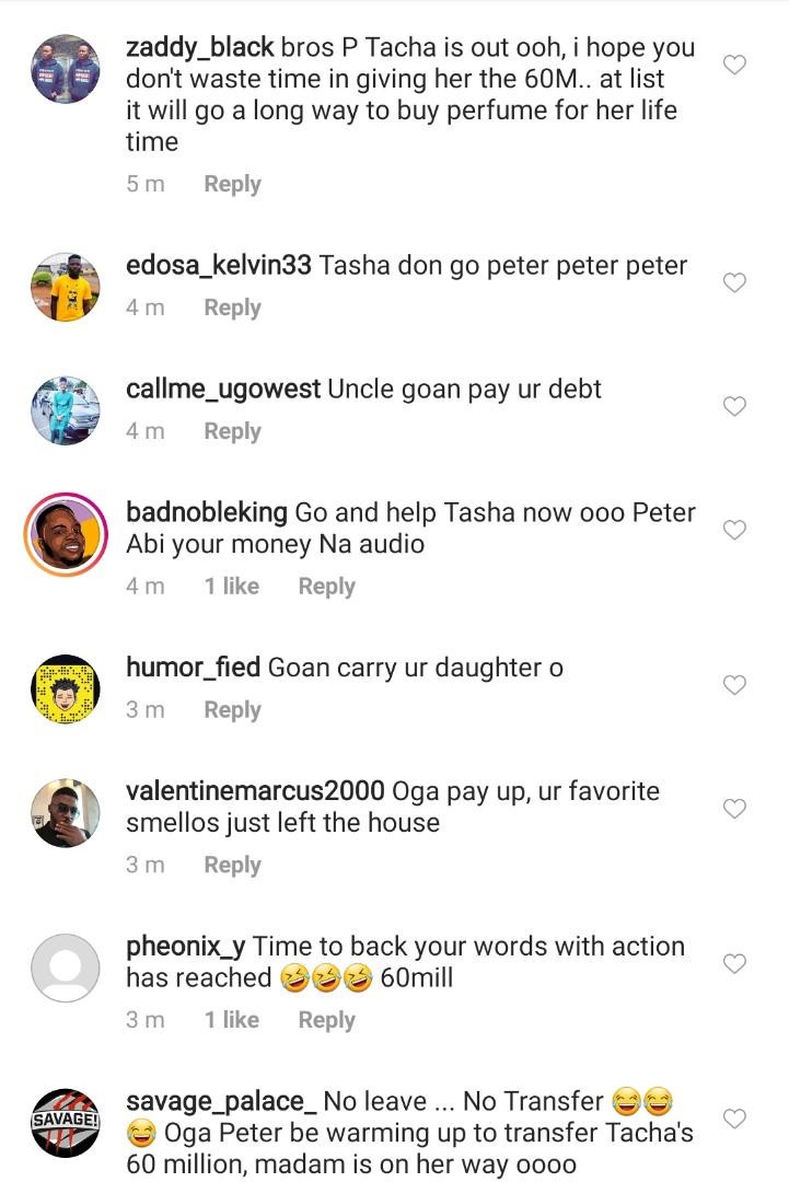 Fans and followers of the Big Brother Naija reality TV show have stormed the social media page of Nigerian Singer, Peter Okoye, to inform him of Tacha’s disqualification from the show and to remind him of his promise to give Tacha the money if she doesn’t win.