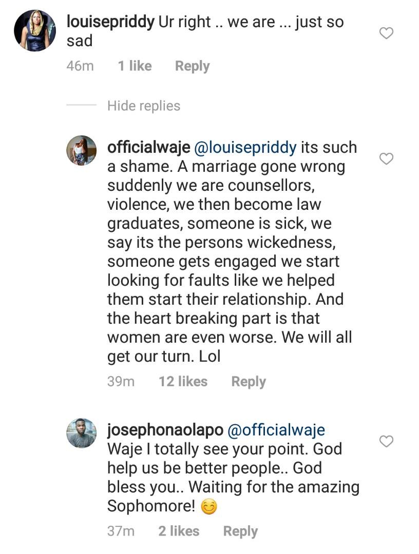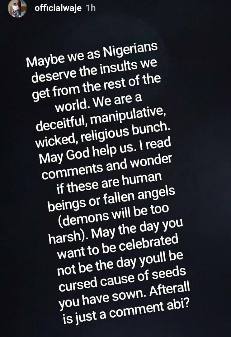 Waje noted that Nigerians in general are deceitful, manipulative, wicked and a religious bunch of unscrupulous element.