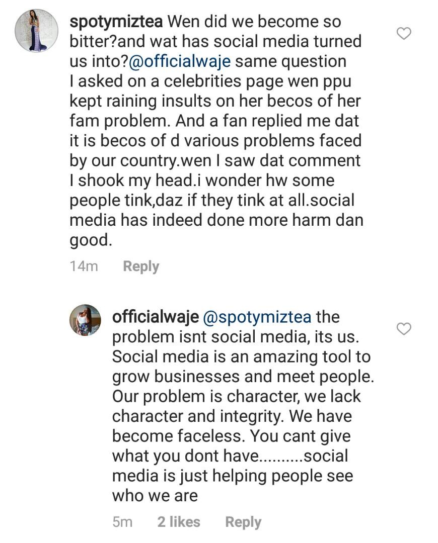 Earlier this morning, singer and mother of one, Waje took to the gram to rant about Nigerians who go on people’s social media to type rubbish, negative and hurtful comments.