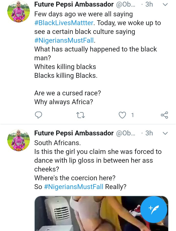 So #NigeriansMustFall Really? pic.twitter.com/8TuOL2rqUn— Future Pepsi Ambassador (@Obong_Hanson) June 13, 2020