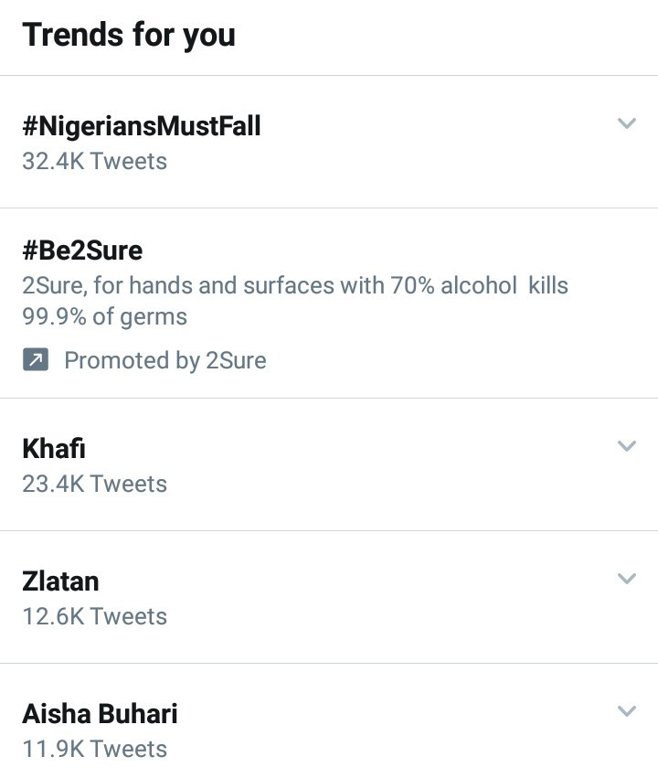 The hashtag, #NigeriansMustFall is currently the number 1 trending topic on Twitter as of this moment. South Africans are using the hashtags #NigeriansMustFall and #NigeriansMustGo to call out Nigerians as they also blame them for the rot in their society.