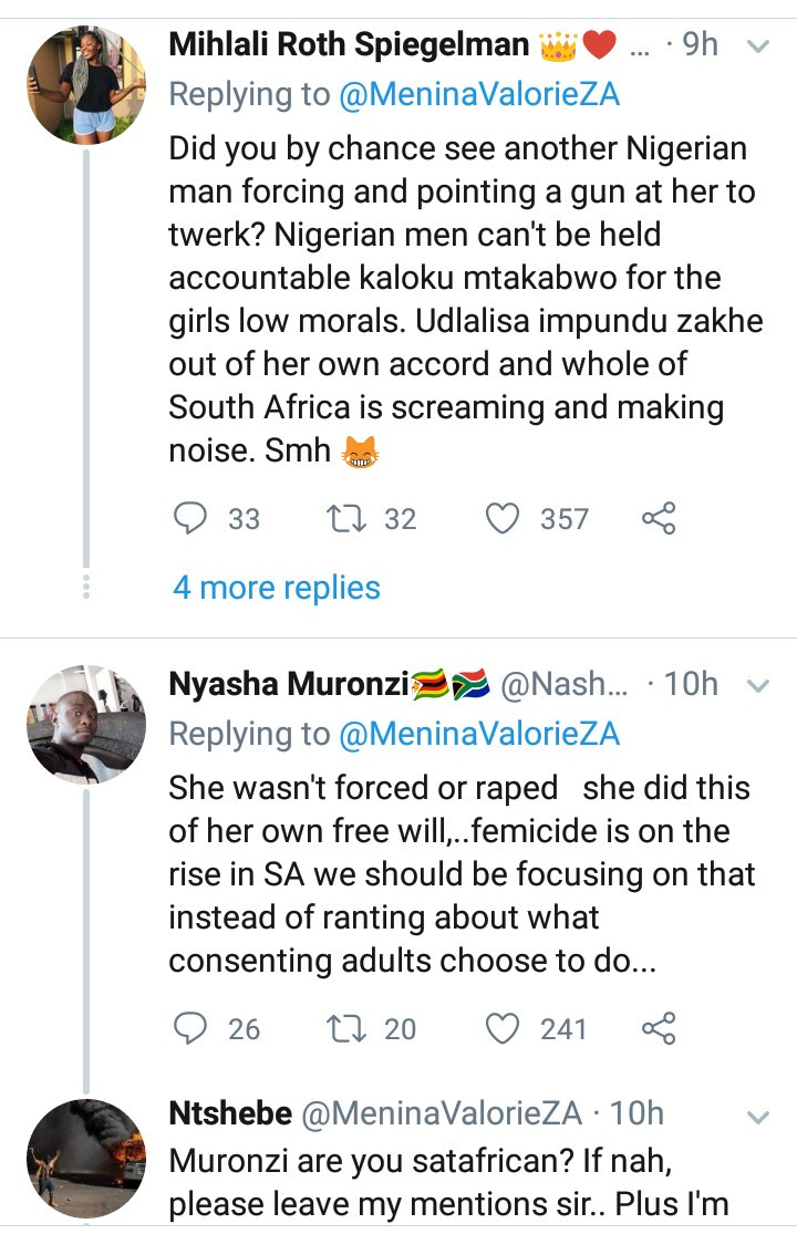 Reacting to the video, some South Africans accused Nigerians of different things, including drugging and raping their women. Even when some of them even pointed out that the woman doesn’t look like she was forced to twerk, others shut them down and stated that, even if she wasn’t forced, she probably must have been drugged.