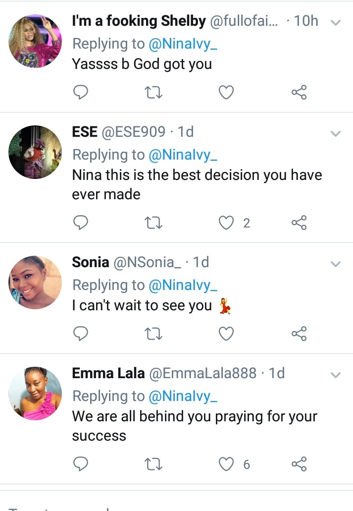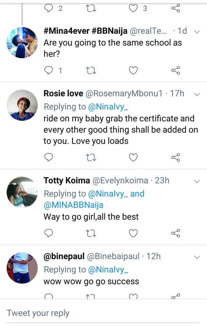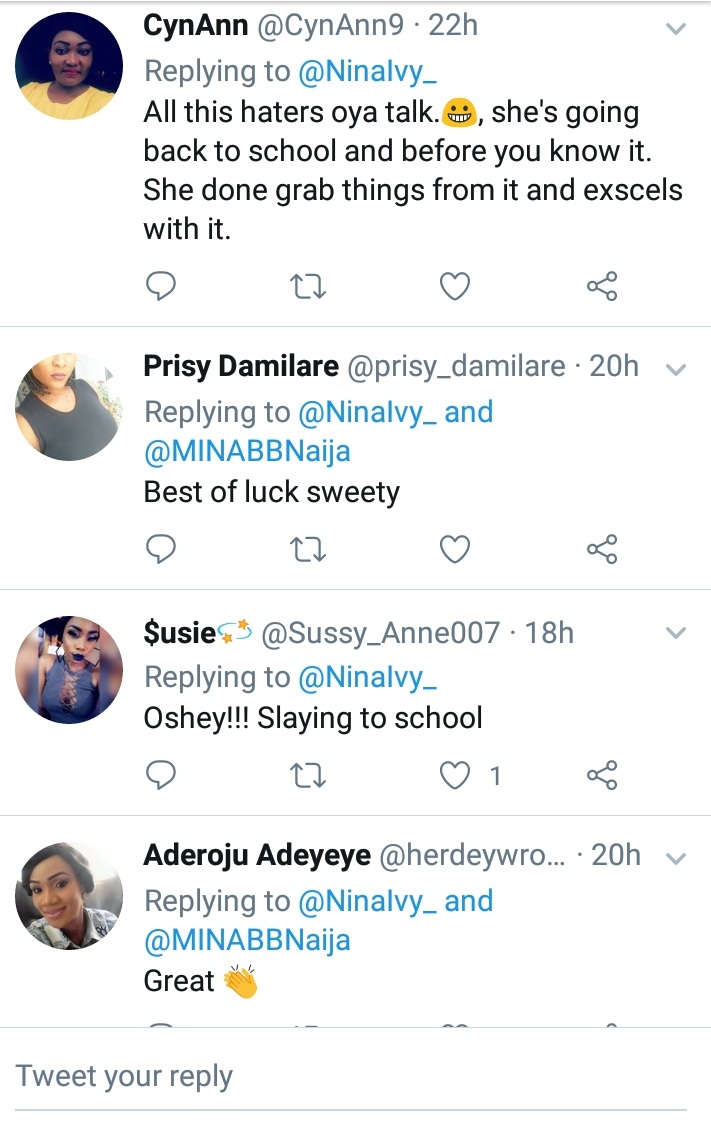 Big Brother Naija finalist, Nina yesterday revealed that she would be going back to school on Monday being the 11th of June.