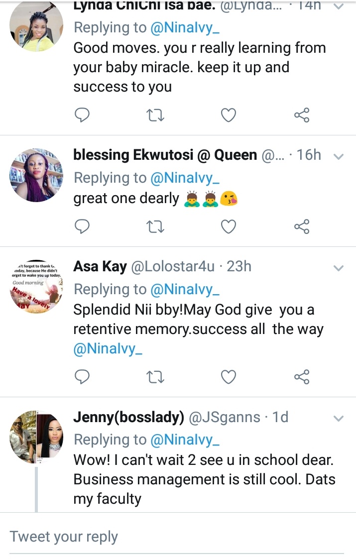 Now the reality star who recently turned 22, has now taken the advise of some Nigerians to go back to school and complete her studies at the Imo State University (IMSU)