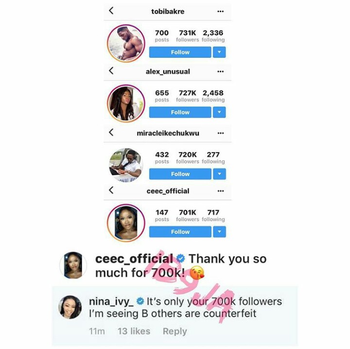 BBNaija finalist, Cee-C has finally hit the 700k followers mark on Instagram, after Alex, Tobi and Miracle already hit theirs.