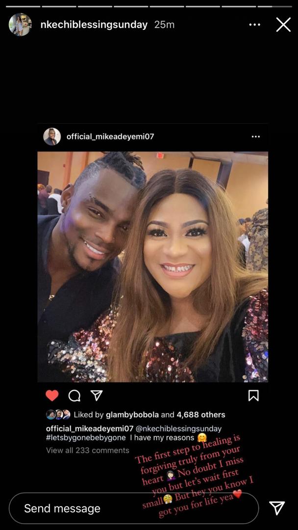 In response, Nkechi reposted Mike’s post on her Instagram story and admitted that she missed him.