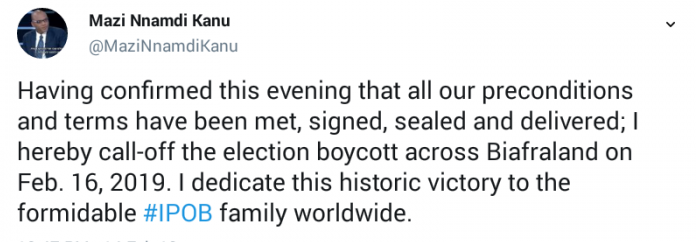 “Having confirmed this evening that all our preconditions and terms have been met, signed, sealed and delivered; I hereby call-off the election boycott across Biafraland on Feb. 16, 2019.